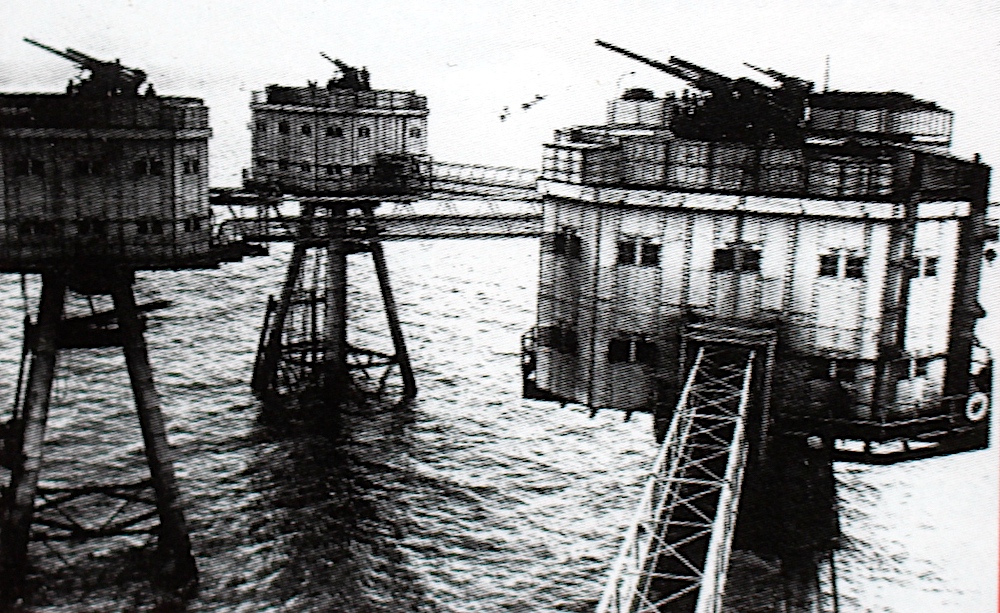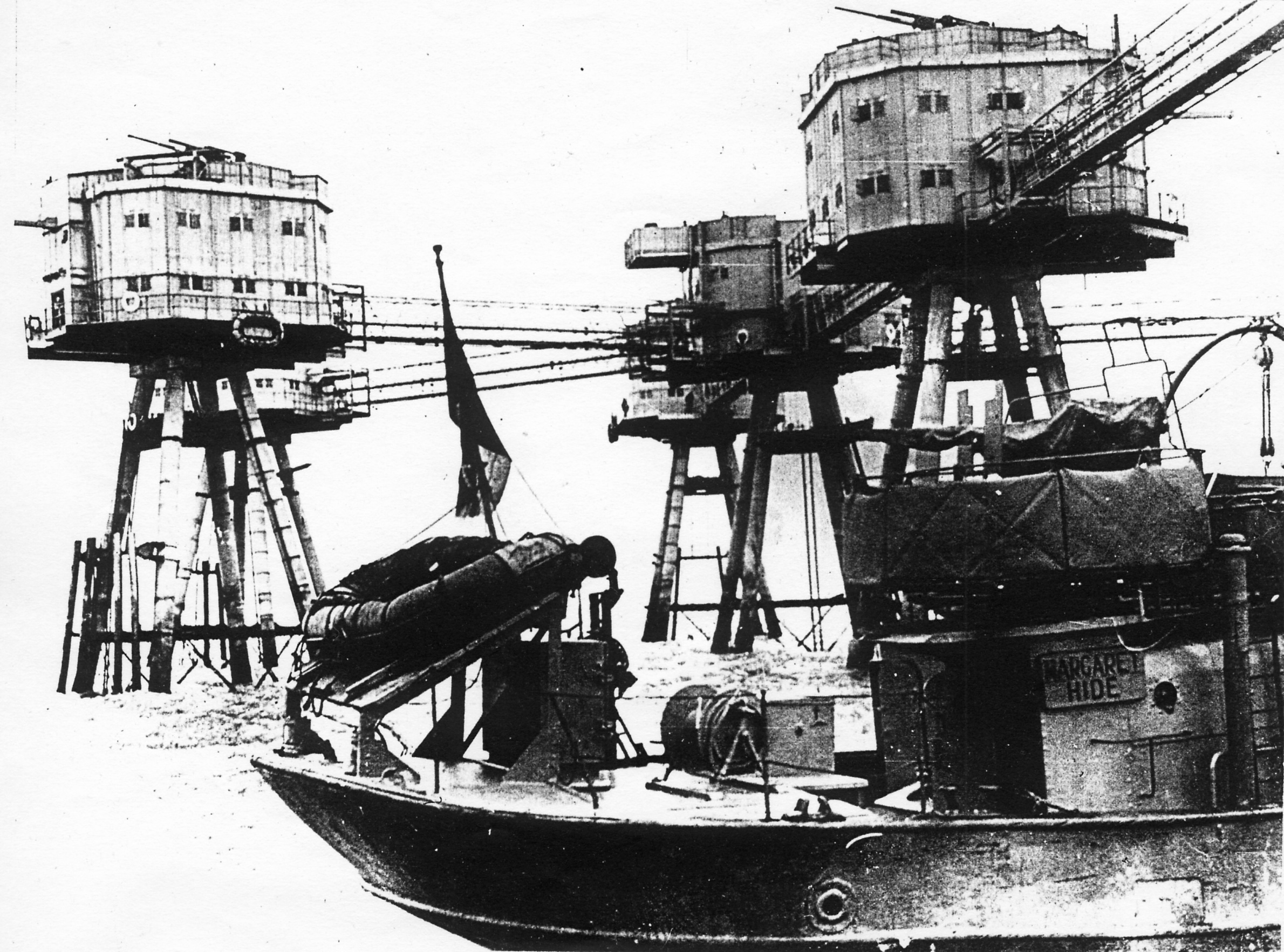 As a result of German mining activity at the outbreak of war in September 1939, an urgent need arose to protect the waters of the Thames Estuary from small naval aircraft sowing magnetic mines. The initial answer was the placing of four Naval Sea Forts, each armed with two 3.7” Heavy AA guns and two 40mm Bofors guns, in the Estuary. They were located as follows: one 7 miles off Harwich, Essex, one 7 miles off Frinton on Sea, Essex, one 5 miles off Margate, Kent and one 12 miles off Herne Bay, Kent. Each of these Forts was manned by 120 men and three officers with crews rotating every six weeks to shore bases at Harwich for the Essex forts and Sheerness for the Kent Forts.