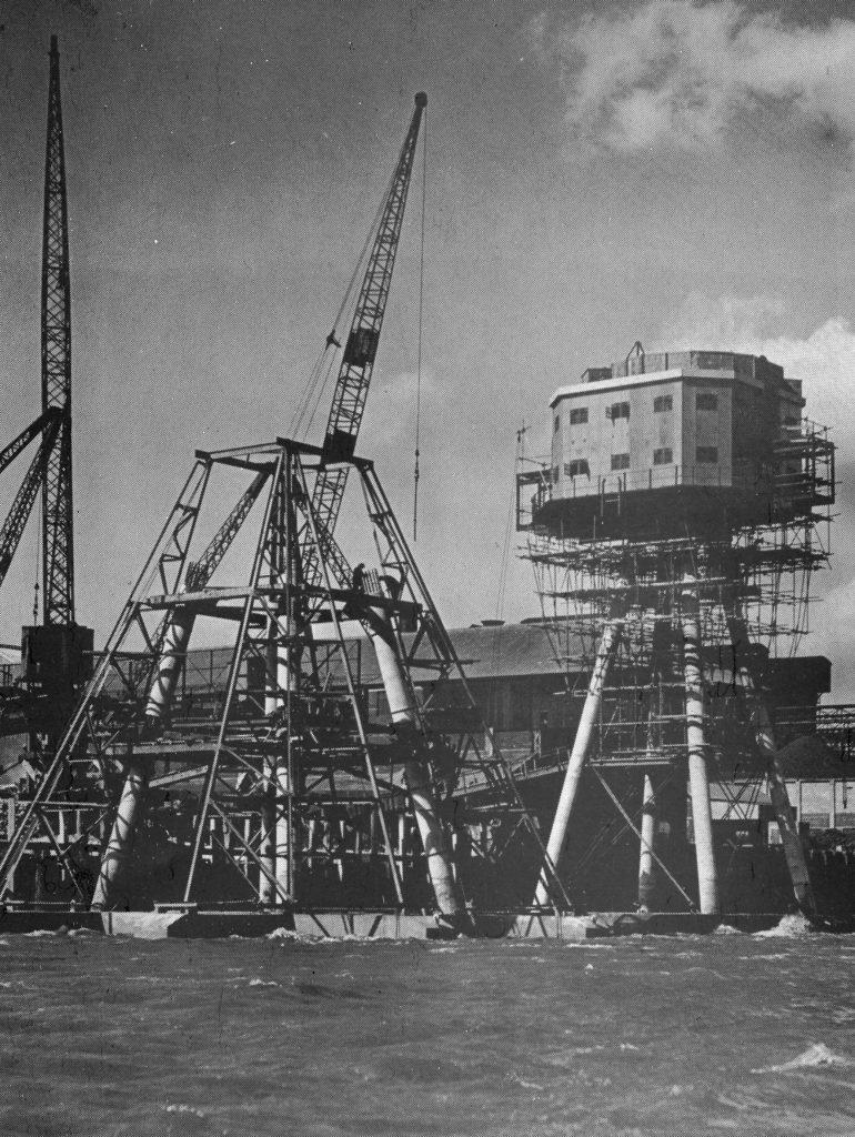 The towers were built at the Red Lion Wharf site in Gravesend, towed down river Via Two Barges, Gold and Silver. These were towed by the steam tug Challenge and then lowered by hand winch onto the sea bed, each tower taking up to eight hours to be placed in position. The first set of towers were placed at the Nore between May and July 1943.