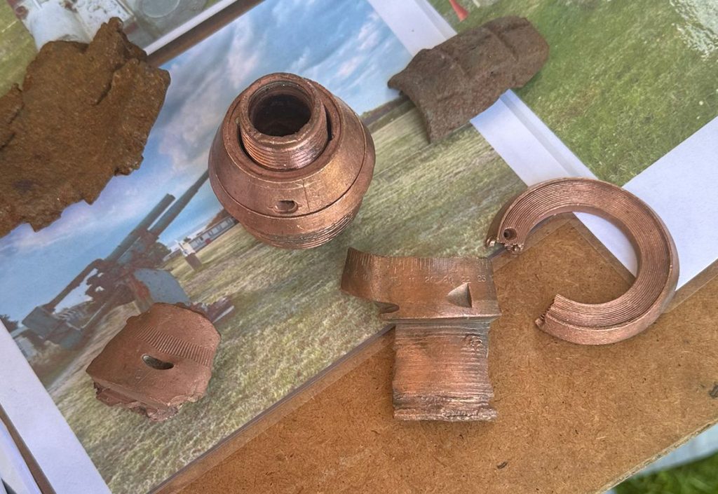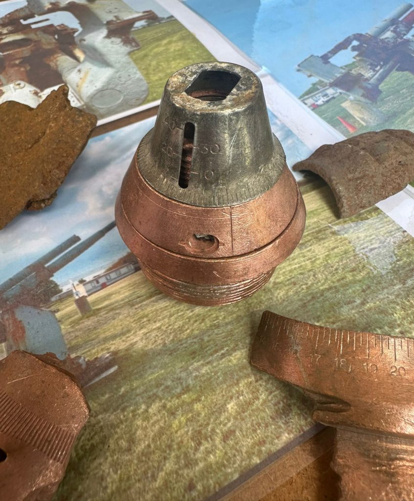 3.7 Inch Detonator and Shrapnel this was dug up by the team of Thameside Aviation Museum that was housed in the now regrettably closed Coalhouse Fort it was dug up from a German plane wreck site near to the Redsand Army Sea Forts and is most likely to have been fired from the Forts.